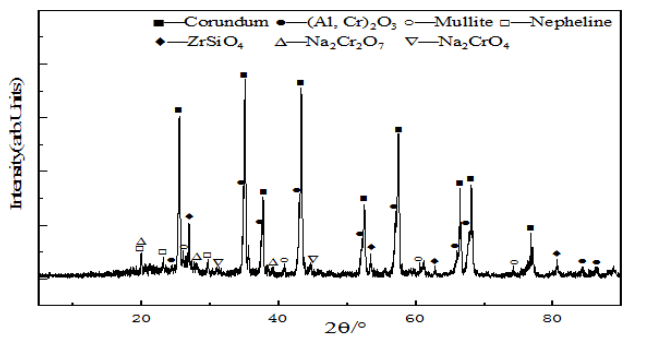 圖4示出了某危廢項目使用1年后耐火磚殘余厚度情況。主要損毀以熱剝落、物理磨損和化學侵蝕為主,窯頭進料端以熱剝落和機械磨損為主,干燥段均勻磨損,高溫區以化學侵蝕、機械磨損為主。其中,高溫區耐火材料快速損毀是停爐檢修的主要原因。某項目鉻剛玉磚使用1年后的殘磚X射線衍射分析(見圖5)顯示,產生了大量的霞石類礦物,同時檢測出有六價鉻存在。其顯微結構分析(見圖6)顯示,致密耐火磚內部玻璃相較多,可以推斷物料中鈉鹽與耐火材料發生反應,侵蝕并導致耐火材料損毀,同時會產生破壞性體積膨脹,破壞耐火材料結構。